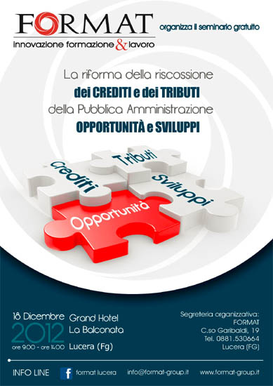 Riforma della riscossione dei crediti e tributi nella Pubblica Amministrazione a Lucera il 18 dicembre 2012 Posted On: 28 Novembre 2012 Posted By: Staff Comments: 0 “RIFORMA DELLA RISCOSSIONE DEI CREDITI E DEI TRIBUTI NELLA PUBBLICA AMMINISTRAZIONE. OPPORTUNITA’ E SVILUPPI”