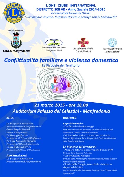 Consapevole della necessità di incidere sul territorio e con l’auspicio di svolgere un servizio all’insegna della concretezza, il LIONS Club MANFREDONIA Host, patrocinato dal Comune di Manfredonia, dall’ AMCI (Associazione Medici Cattolici Italiani), dall’UCIIM (Unione Cattolica Italiana Insegnanti Medi) e dall’AMMI (Associazione Mogli Medici Italiani), interviene su tale problematica con il meeting “Conflittualità familiare e violenza domestica. Le risposte del territorio”.