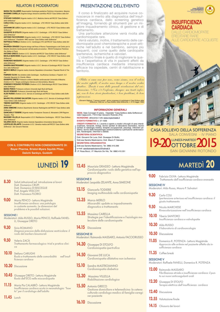 Dal 19 al 20 ottobre 2015 , nella sala convegni del quarto piano dell’IRCCS Casa Sollievo della Sofferenza, si svolgerà il convegno “Insufficienza cardiaca, dalle cardiomiopatie ereditarie rare alle cardiopatie acquisite” organizzato dal Servizio di Cardiologia e dall’Unità di Terapia Intensiva Coronarica dell’Ospedale.