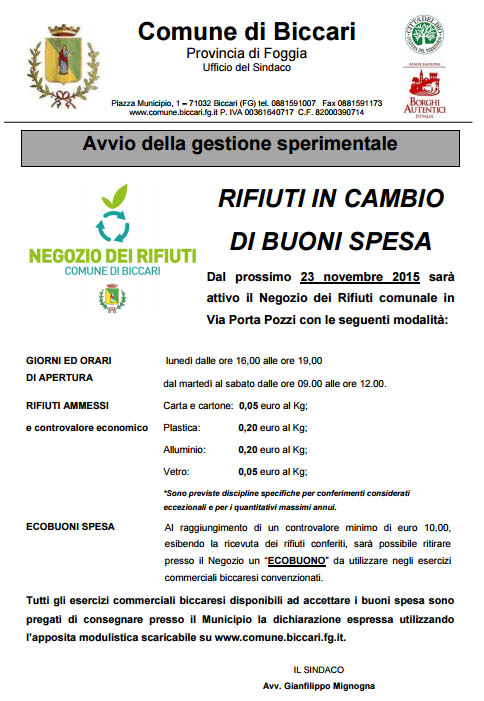 Inaugurazione “Negozio dei Rifiuti” al Comune di Biccari, dai Monti Dauni modello di sviluppo importante nell’ambito dei rifiuti Posted On: 27 Novembre 2015 Posted By: Staff Comments: 0 Rifiuti in cambio di buoni spesa DIFFERENZIARE CONVIENE !!!