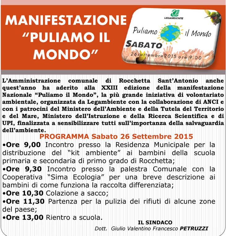 Programma iniziativa Puliamo il Mondo il 26 settembre 2015 a Rocchetta Sant’Antonio (Fg)