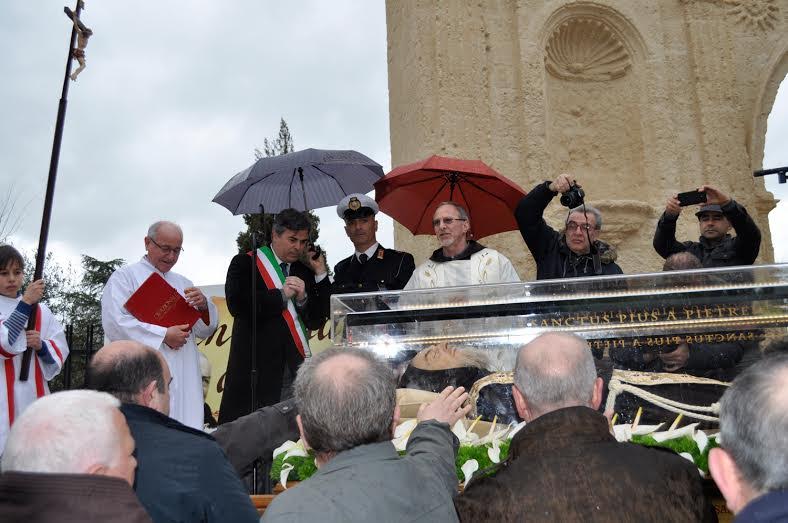«Desidero esprimere tutta mia la gioia, come sindaco di Foggia e fedele oltre che devoto del nostro Padre Pio, per aver accolto a Foggia, nella Chiesa di Sant’Anna, il cui convento per sette mesi ospitò San Pio, le spoglie di un Santo al quale la nostra comunità è legata in modo meraviglioso. Quello di oggi è stato un evento speciale, storico, che ci ha commosso in modo profondo, tornando a farci percepire il senso più autentico della fede e l’amore per un Santo che ha lasciato in questa terra un segno indelebile fatto solidarietà e vicinanza agli ultimi. Valori che hanno in Casa Sollievo della Sofferenza il loro simbolo. Tutti noi, cittadini e fedeli di Capitanata, sentiamo dunque Padre Pio un po’ come il “nostro” Santo.