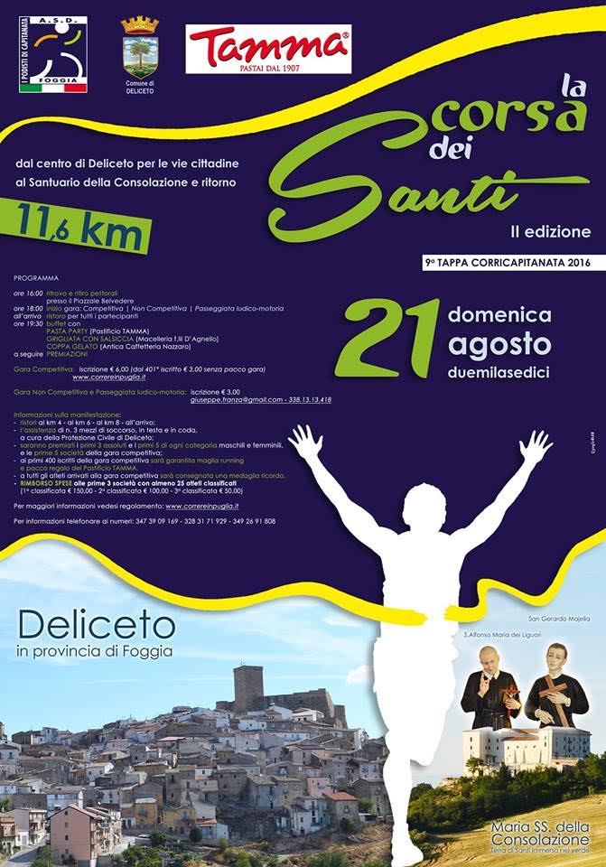L’Associazione Sportiva Dilettantistica I Podisti di Capitanata organizza la Corsa dei Santi, seconda edizione, sulla distanza di 11,6 km a Deliceto, domenica 21 agosto.
