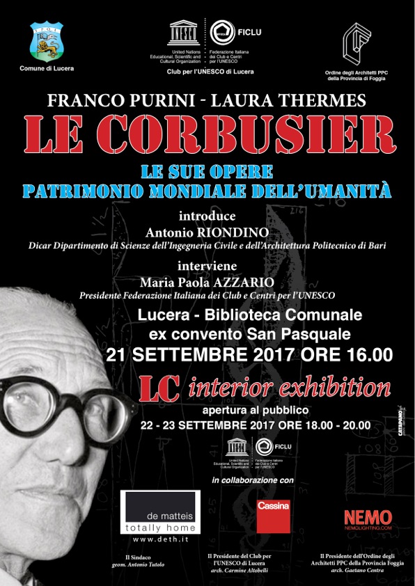 Per festeggiare tale ricorrenza, il Club per l’UNESCO di Lucera (FG), presieduto dall’arch. Carmine Altobelli, in collaborazione con la Città di Lucera e con l’Ordine degli Architetti PPC della Provincia di Foggia, ha organizzato, presso la Nuova Biblioteca Comunale “Ruggero Bonghi” di Lucera (ex convento del SS. Salvatore) una mostra (INTERIOR EXHIBITION), aperta al pubblico nei giorni, 22 e 23 settembre 2017, dalle ore 18,00 alle ore 20,00 e un convegno inaugurale (“LE CORBUSIER. Le sue opere patrimonio mondiale dell’Umanità) in programma, nella stessa sede, il 21 settembre 2017 alle ore 16,00.