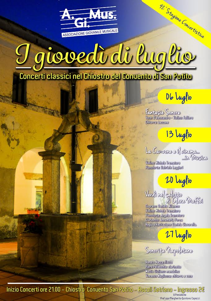 I giovedì di luglio: programma dei concerti classici nel Chiostro del Convento di San Potito di Ascoli Satriano (Fg)