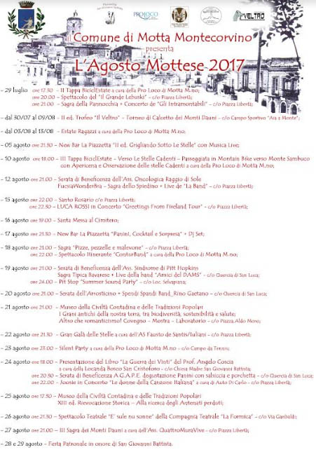 Si parte il 29 luglio con la II Tappa BiciclEstate, lo Spettacolo del “Il Grande Lebuski”, Sagra della Pannocchia e il Concerto de “Gli Intramontabili per poi arrivare al 10 agosto con il grande spettacolo dell’Osservazione delle stelle Cadenti a Monte Sambuco a seguire il torneo di calcetto “Il Veltro” che richiama tutte le squadre dei Monti Dauni. Da lì un crescendo di eventi: “Sagra Bavarese”, “Arrosticini Abbruzzesi”, “Salsiccia Mottese”, “Pizze, Pizzelle e Malevone” con artisti di strada, Corteo Storico, Sfilate, concerto del grande Luca Rossi e Cover Band di Rino Gaetano con la Spendi Spandi Band_Rino Gaetano, ancora concerti di musica Rock e Pop con “La Band” e “Gli amici del DAMS”, studi sul Brigantaggio, Convegni, Teatro in vernacolo con La Compagnia “La Formica”, tanta Beneficenza e per concludere il cartellone con l’ormai rodata “Sagra Dei Monti Dauni” che attira ogni anno migliaia di persone da tutta la provincia e che porta a tavola più di venti pietanze della tradizione!