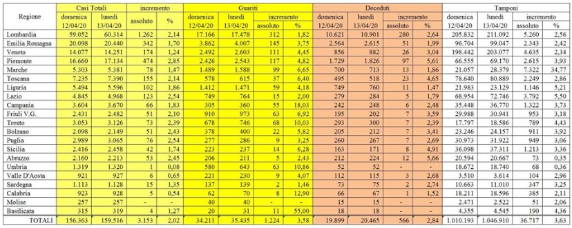 CORONAVIRUS SITUAZIONE ITALIA AL 13 APRILE 2020 – Presso la sede del Dipartimento della Protezione Civile proseguono i lavori del Comitato Operativo al fine di assicurare il coordinamento degli interventi delle componenti e delle strutture operative del Servizio Nazionale della protezione civile. Nell’ambito del monitoraggio sanitario relativo alla diffusione del Coronavirus sul territorio nazionale, al momento 103.616 persone risultano positive al virus. Ad oggi, in Italia sono stati 159.516 i casi totali. Nel dettaglio: i casi attualmente positivi sono 31.935 in Lombardia, 13.818 in Emilia-Romagna, 12.765 in Piemonte, 10.766 in Veneto, 6.257 in Toscana, 3.365 in Liguria, 3.080 nelle Marche, 3.920 nel Lazio, 3.062 in Campania, 2.080 nella Provincia autonoma di Trento, 2.512 in Puglia, 1.307 in Friuli Venezia Giulia, 2.050 in Sicilia, 1.778 in Abruzzo, 1.537 nella Provincia autonoma di Bolzano, 625 in Umbria, 914 in Sardegna, 791 in Calabria, 582 in Valle d’Aosta, 270 in Basilicata e 202 in Molise. Sono 35.435 le persone guarite. I deceduti sono 20.465, ma questo numero potrà essere confermato solo dopo che l’Istituto Superiore di Sanità avrà stabilito la causa effettiva del decesso.