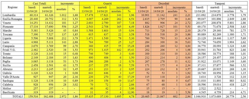 CORONAVIRUS SITUAZIONE ITALIA AL 14 APRILE 2020 – presso la sede del Dipartimento della Protezione Civile proseguono i lavori del Comitato Operativo al fine di assicurare il coordinamento degli interventi delle componenti e delle strutture operative del Servizio Nazionale della protezione civile. Nell’ambito del monitoraggio sanitario relativo alla diffusione del Coronavirus sul territorio nazionale, al momento 104.291 persone risultano positive al virus. Ad oggi, in Italia sono stati 162.488 i casi totali. Nel dettaglio: i casi attualmente positivi sono 32.363 in Lombardia, 13.778 in Emilia-Romagna, 13.055 in Piemonte, 10.736 in Veneto, 6.352 in Toscana, 3.466 in Liguria, 3.095 nelle Marche, 4.022 nel Lazio, 3.094 in Campania, 2.082 nella Provincia autonoma di Trento, 2.552 in Puglia, 899 in Friuli Venezia Giulia, 2.071 in Sicilia, 1.800 in Abruzzo, 1.564 nella Provincia autonoma di Bolzano, 622 in Umbria, 900 in Sardegna, 816 in Calabria, 559 in Valle d’Aosta, 265 in Basilicata e 200 in Molise. Sono 37.130 le persone guarite. I deceduti sono 21.067, ma questo numero potrà essere confermato solo dopo che l’Istituto Superiore di Sanità avrà stabilito la causa effettiva del decesso.