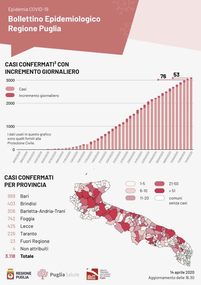 CORONAVIRUS SITUAZIONE PUGLIA AL 14 APRILE 2020 – il presidente della Regione Puglia, Michele Emiliano, sulla base delle informazioni del direttore del dipartimento Promozione della Salute Vito Montanaro, informa che oggi martedì 14, in Puglia, sono stati registrati 1.149 test per l’infezione da Covid-19 coronavirus e sono risultati positivi 53 casi, così suddivisi: