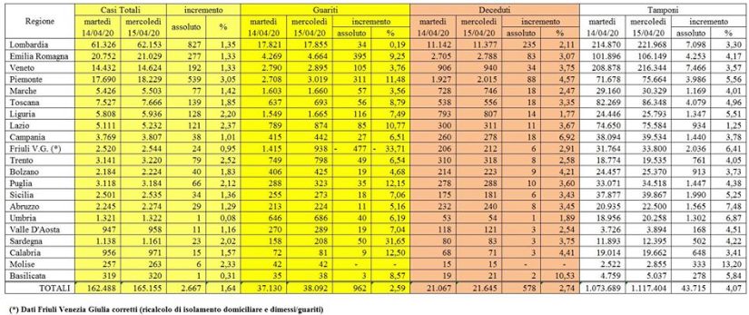 CORONAVIRUS SITUAZIONE ITALIA AL 15/04/2020 – presso la sede del Dipartimento della Protezione Civile proseguono i lavori del Comitato Operativo al fine di assicurare il coordinamento degli interventi delle componenti e delle strutture operative del Servizio Nazionale della protezione civile. Nell’ambito del monitoraggio sanitario relativo alla diffusione del Coronavirus sul territorio nazionale, al momento 105.418 persone risultano positive al virus. Ad oggi, in Italia sono stati 165.155 i casi totali. Nel dettaglio: i casi attualmente positivi sono 32.921 in Lombardia, 13.577 in Emilia-Romagna, 13.195 in Piemonte, 10.789 in Veneto, 6.417 in Toscana, 3.464 in Liguria, 3.097 nelle Marche, 4.047 nel Lazio, 3.087 in Campania, 2.104 nella Provincia autonoma di Trento, 2.573 in Puglia, 1.394 in Friuli Venezia Giulia, 2.081 in Sicilia, 1.810 in Abruzzo, 1.576 nella Provincia autonoma di Bolzano, 582 in Umbria, 870 in Sardegna, 819 in Calabria, 548 in Valle d’Aosta, 261 in Basilicata e 206 in Molise. Sono 38.092 le persone guarite. I deceduti sono 21.645, ma questo numero potrà essere confermato solo dopo che l’Istituto Superiore di Sanità avrà stabilito la causa effettiva del decesso.