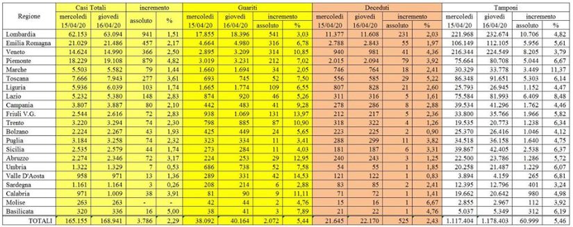 CORONAVIRUS SITUAZIONE ITALIA AL 16/04/2020 – presso la sede del Dipartimento della Protezione Civile proseguono i lavori del Comitato Operativo al fine di assicurare il coordinamento degli interventi delle componenti e delle strutture operative del Servizio Nazionale della protezione civile. Nell’ambito del monitoraggio sanitario relativo alla diffusione del Coronavirus sul territorio nazionale, al momento 106.607 persone risultano positive al virus. Ad oggi, in Italia sono stati 168.941 i casi totali. Nel dettaglio: i casi attualmente positivi sono 33.090 in Lombardia, 13.663 in Emilia-Romagna, 13.783 in Piemonte, 10.800 in Veneto, 6.613 in Toscana, 3.437 in Liguria, 3.124 nelle Marche, 4.144 nel Lazio, 3.118 in Campania, 2.087 nella Provincia autonoma di Trento, 2.625 in Puglia, 1.330 in Friuli Venezia Giulia, 2.108 in Sicilia, 1.850 in Abruzzo, 1.593 nella Provincia autonoma di Bolzano, 536 in Umbria, 865 in Sardegna, 847 in Calabria, 518 in Valle d’Aosta, 273 in Basilicata e 203 in Molise. Sono 40.164 le persone guarite. I deceduti sono 22.170, ma questo numero potrà essere confermato solo dopo che l’Istituto Superiore di Sanità avrà stabilito la causa effettiva del decesso.
