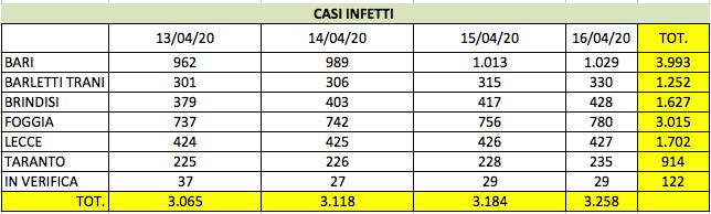 PUGLIA=Come si evince dalla tabella “CASI INFETTI”, il numero dei nuovi casi in Puglia sta aumentando giorno dopo giorno con un incremento dello 0.3% (mediana).Nello specifico, un notevole incremento nelle ultime 24 ore è stato osservato nelle province di: BAT, FOGGIA e TARANTO.Invece, se si considera il numero TOTALE di casi nel periodo 13-16 Aprile, le province più colpite restano BARI e FOGGIA.