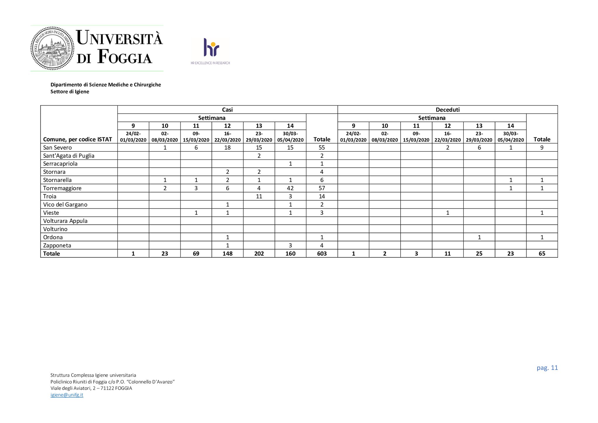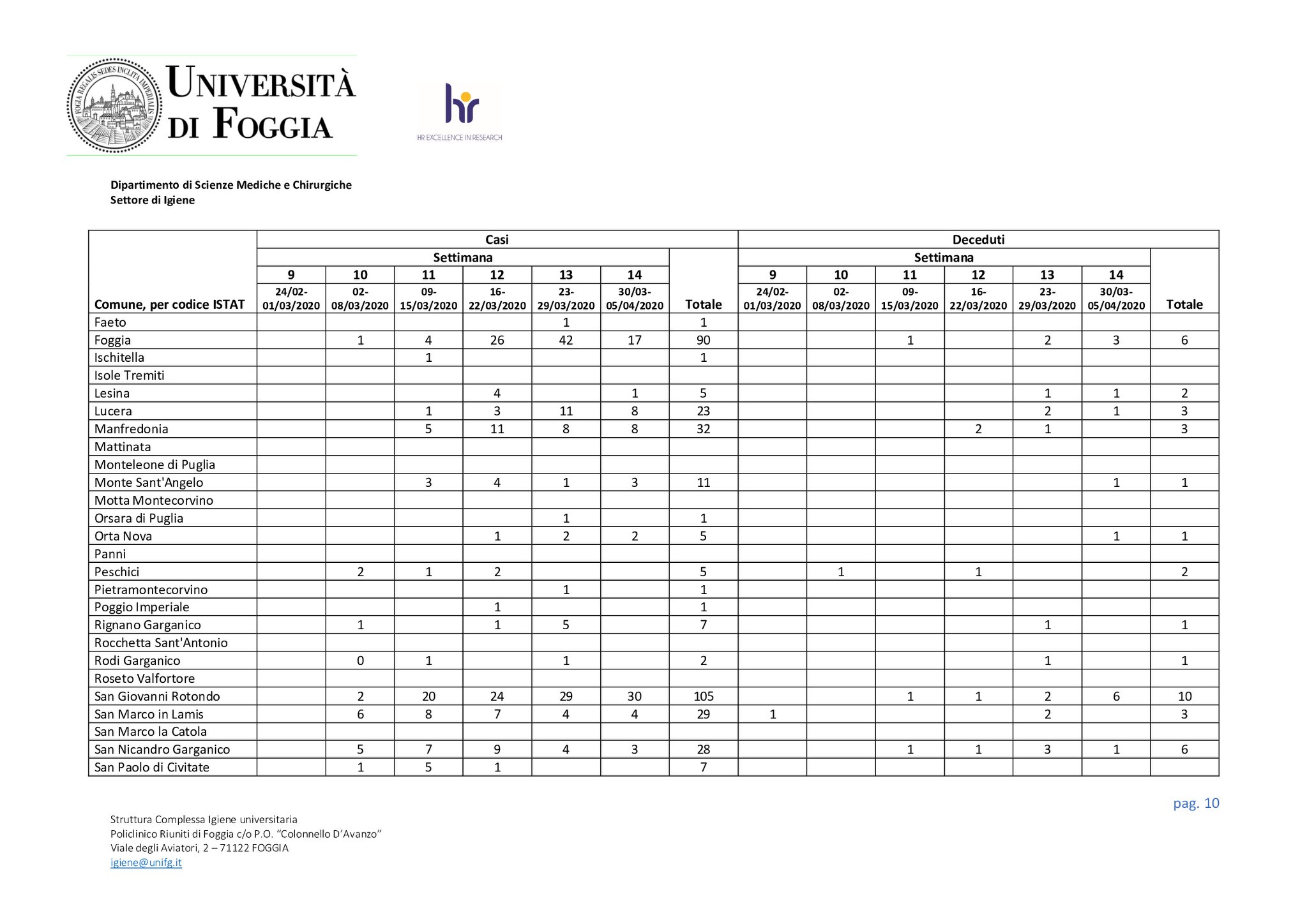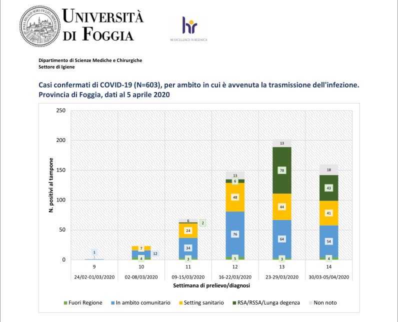 DATI DETTAGLIATI CONTAGIATI/DECESSI PER OGNI CITTA’ DELLA CAPITANATA A CURA DELL’UNIVERSITA’ DEGLI STUDI DI FOGGIA AGGIORNATI AL 5/04/2020 – L’UniFG ha reso noto i dati 📊del contagio e dei decessi in provincia di Foggia comune per comune. Il triste primato spetta a San Giovanni Rotondo, con 105 contagi e 10 deceduti. A seguire Foggia con 90 contagi e 6 deceduti. Ed ancora Torremaggiore con 57 contagi e 1 morto, San Severo 55 contagi e 9 morti, Cerignola 46 contagi e 8 morti, Bovino 33 contagi e 2 morti, Manfredonia con 32 contagi e 3 morti, San Marco il lamis 29 contagi e 3 morti, San Nicandro 28 contagi e 6 morti, Lucera 23 contagi e 3 morti e via via a scendere. Sono invece 21 i comuni restati immuni dal contagio. E’ evidente che non ha funzionato qualcosa nelle RSA/RSSA dell’intera provincia, si poteva fare qualcosa per evitare tutto ciò?