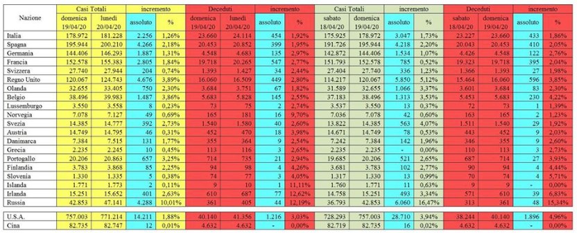 CORONAVIRUS SITUAZIONE ITALIA AL 20/04/2020 – Continua l’impegno del Dipartimento nelle attività di coordinamento di tutte le componenti e strutture operative del Servizio Nazionale della protezione civile. In particolare, nell’ambito del monitoraggio sanitario relativo alla diffusione del Coronavirus sul nostro territorio, a oggi, 20 aprile, il totale delle persone che hanno contratto il virus è 181.228, con un incremento rispetto a ieri di 2.256 nuovi casi. Il numero totale di attualmente positivi è di 108.237, con un decremento di 20 assistiti rispetto a ieri. Tra gli attualmente positivi 2.573 sono in cura presso le terapie intensive, con una decrescita di 62 pazienti rispetto a ieri. 24.906 persone sono ricoverate con sintomi, con un decremento di 127 pazienti rispetto a ieri. 80.758 persone, pari al 75% degli attualmente positivi, sono in isolamento senza sintomi o con sintomi lievi. Rispetto a ieri i deceduti sono 454 e portano il totale a 24.114. Il numero complessivo dei dimessi e guariti sale invece a 48.877, con un incremento di 1.822 persone rispetto a ieri. Nel dettaglio, i casi attualmente positivi sono 34.587 in Lombardia, 13.522 in Emilia-Romagna, 14.557 in Piemonte, 10.061 in Veneto, 6.568 in Toscana, 3.496 in Liguria, 3.212 nelle Marche, 4.365 nel Lazio, 3.019 in Campania, 1.929 nella Provincia autonoma di Trento, 2.810 in Puglia, 1.190 in Friuli Venezia Giulia, 2.210 in Sicilia, 2.062 in Abruzzo, 1.540 nella Provincia autonoma di Bolzano, 424 in Umbria, 854 in Sardegna, 828 in Calabria, 548 in Valle d’Aosta, 242 in Basilicata e 213 in Molise.