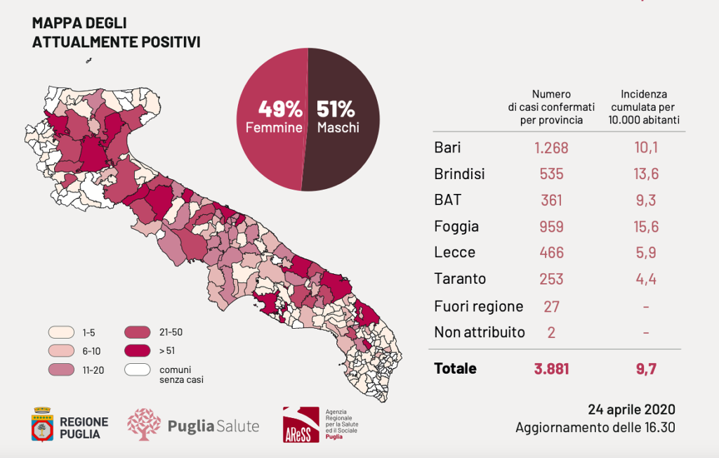 Il totale dei casi positivi Covid in Puglia è di 3.881 così divisi: