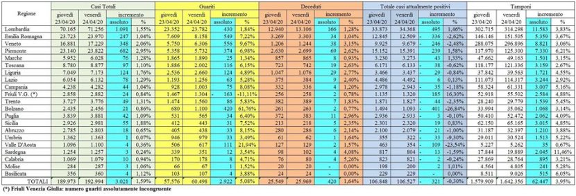 SITUAZIONE CORONAVIRUS ITALIA AL 24 APRILE 2020 – Continua l’impegno del Dipartimento nelle attività di coordinamento di tutte le componenti e strutture operative del Servizio Nazionale della protezione civile. In particolare, nell’ambito del monitoraggio sanitario relativo alla diffusione del Coronavirus sul nostro territorio, a oggi, 24 aprile, il totale delle persone che hanno contratto il virus è 192.994, con un incremento rispetto a ieri di 3.021 nuovi casi. Il numero totale di attualmente positivi è di 106.527, con un decremento di 321 assistiti rispetto a ieri. Tra gli attualmente positivi 2.173 sono in cura presso le terapie intensive, con una decrescita di 94 pazienti rispetto a ieri.