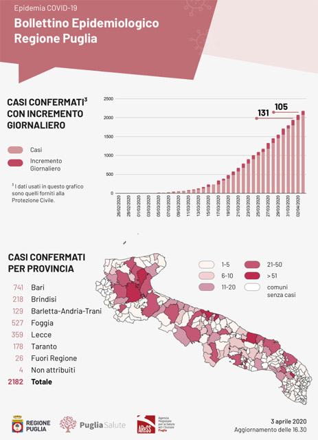 PUGLIA – Il presidente della Regione Puglia, Michele Emiliano, sulla base delle informazioni del direttore del dipartimento Promozione della Salute Vito Montanaro, informa che oggi venerdì 3 aprile, in Puglia, sono stati registrati 1.270 test per l’infezione da Covid-19 coronavirus e sono risultati positivi 105 casi, così suddivisi: 41 nella Provincia di Bari;3 nella Provincia Bat;10 nella Provincia di Brindisi; 25 nella Provincia di Foggia;6 nella Provincia di Lecce;15 nella Provincia di Taranto;6 fuori regione (1 caso non attribuito ieri è stato attribuito oggi alla relativa provincia di appartenenza). Sono stati registrati oggi 20 decessi: 11 in provincia di Lecce, 6 in provincia di Foggia, 2 in provincia di Brindisi, 1 in provincia Bat. Dall’inizio dell’emergenza sono stati effettuati 17.924 test. Sono 65 i pazienti guariti. Il totale dei casi positivi Covid in Puglia è di 2.182 così divisi: 741 nella Provincia di Bari; 129 nella Provincia di Bat; 218 nella Provincia di Brindisi; 527 nella Provincia di Foggia; 359 nella Provincia di Lecce, 178 nella Provincia di Taranto; 26 attribuiti a residenti fuori regione;4 per i quali è in corso l’attribuzione della relativa provincia.