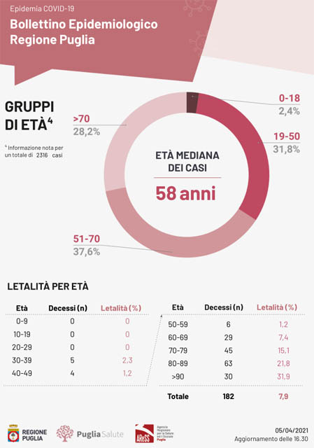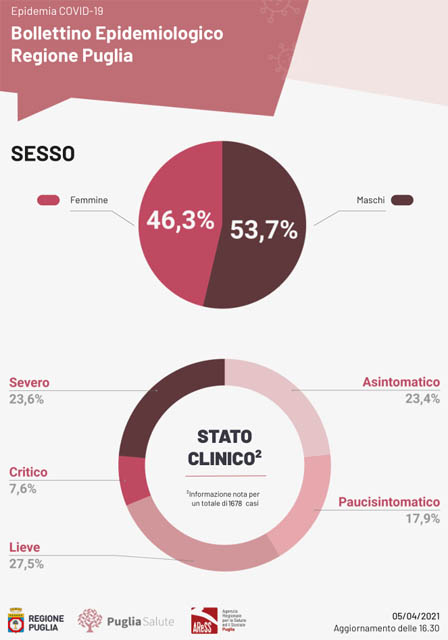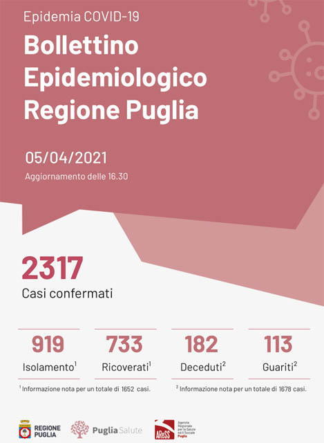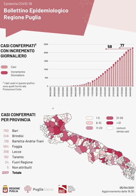 SITUAZIONE COVID-19 IN PUGLIA al 5/04/2020: Il presidente della Regione Puglia, Michele Emiliano, sulla base delle informazioni del direttore del dipartimento Promozione della Salute Vito Montanaro, informa che oggi domenica 5 aprile, in Puglia, sono stati registrati 1.103 test per l’infezione da Covid-19 coronavirus e sono risultati positivi 77 casi, così suddivisi: 28 nella Provincia di Bari; 9 nella Provincia Bat; 12 nella Provincia di Brindisi; 18nella Provincia di Foggia, 6 nella Provincia di Lecce;2 nella Provincia di Taranto, 1 fuori regione (1 caso non attribuito ieri è stato attribuito oggi alla relativa provincia di appartenenza). Sono stati registrati oggi 9 decessi: 5 in provincia di Foggia, 3 in provincia di Lecce, 1 in provincia BAT. Dall’inizio dell’emergenza sono stati effettuati 20.080 test.Sono 113 i pazienti guariti. Il totale dei casi positivi Covid in Puglia è di 2.317 così divisi: 790 nella Provincia di Bari, 138 nella Provincia di Bat; 246 nella Provincia di Brindisi; 564 nella Provincia di Foggia; 368 nella Provincia di Lecce; 182 nella Provincia di Taranto; 24 attribuiti a residenti fuori regione; 5 per i quali è in corso l’attribuzione della relativa provincia.I Dipartimenti di prevenzione delle Asl hanno attivato tutte le procedure per l’acquisizione delle notizie anamnestiche ed epidemiologiche, finalizzate a rintracciare i contatti stretti.