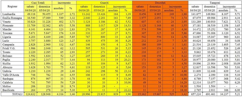 SITUAZIONE COVID-19 IN ITALIA AL 5/04/2020 : presso la sede del Dipartimento della Protezione Civile proseguono i lavori del Comitato Operativo al fine di assicurare il coordinamento degli interventi delle componenti e delle strutture operative del Servizio Nazionale della protezione civile. Nell’ambito del monitoraggio sanitario relativo alla diffusione del Coronavirus sul territorio nazionale, al momento 91.246 persone risultano positive al virus. Ad oggi, in Italia sono stati 128.948 i casi totali. Nel dettaglio: i casi attualmente positivi sono 28.124 in Lombardia, 12.837 in Emilia-Romagna, 10.177 in Piemonte, 9.409 in Veneto, 5.185 in Toscana, 3.578 nelle Marche, 3.186 nel Lazio, 3.093 in Liguria, 2.621 in Campania, 2.022 in Puglia, 1.774 in Sicilia, 1.795 nella Provincia autonoma di Trento, 1.363 in Friuli Venezia Giulia, 1.420 in Abruzzo, 1.226 nella Provincia autonoma di Bolzano, 898 in Umbria, 815 in Sardegna, 706 in Calabria, 576 in Valle d’Aosta, 254 in Basilicata e 187 in Molise. Sono 21.815 le persone guarite. I deceduti sono 15.887, ma questo numero potrà essere confermato solo dopo che l’Istituto Superiore di Sanità avrà stabilito la causa effettiva del decesso.