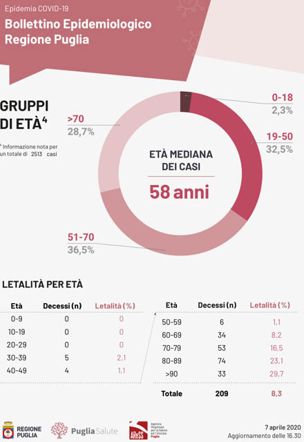 SITUAZIONE PUGLIA COVID-19 AL 7 APRILE 2020: il presidente della Regione Puglia, Michele Emiliano, sulla base delle informazioni del direttore del dipartimento Promozione della Salute Vito Montanaro, informa che oggi martedì 7 aprile, in Puglia, sono stati registrati 1090 test per l’infezione da Covid-19 coronavirus e sono risultati positivi 70 casi, così suddivisi: