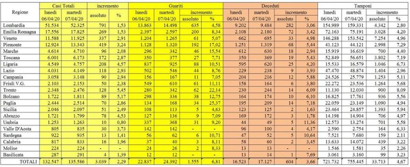 Sono 24.392 le persone guarite. I deceduti sono 17.127, ma questo numero potrà essere confermato solo dopo che l’Istituto Superiore di Sanità avrà stabilito la causa effettiva del decesso.
