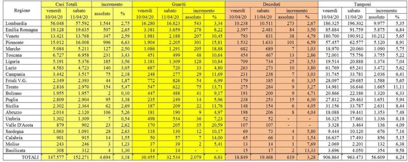 CORONAVIRUS SITUAZIONE ITALIA ALL’11 APRILE 2020 – presso la sede del Dipartimento della Protezione Civile proseguono i lavori del Comitato Operativo al fine di assicurare il coordinamento degli interventi delle componenti e delle strutture operative del Servizio Nazionale della protezione civile. Nell’ambito del monitoraggio sanitario relativo alla diffusione del Coronavirus sul territorio nazionale, al momento 100.269 persone risultano positive al virus. Ad oggi, in Italia sono stati 152.271 i casi totali. Nel dettaglio: i casi attualmente positivi sono 30.258 in Lombardia, 13.495 in Emilia-Romagna, 12.170 in Piemonte, 10.749 in Veneto, 5.992 in Toscana, 3.730 nel Lazio, 3.333 in Liguria, 3.231 nelle Marche, 3.002 in Campania, 2.402 in Puglia, 2.064 nella Provincia autonoma di Trento, 2.001 in Sicilia, 1.724 in Abruzzo, 1.382 in Friuli Venezia Giulia, 1.269 nella Provincia autonoma di Bolzano, 888 in Sardegna, 792 in Calabria, 723 in Umbria, 590 in Valle d’Aosta, 281 in Basilicata e 193 in Molise. Sono 32.534 le persone guarite. I deceduti sono 19.468, ma questo numero potrà essere confermato solo dopo che l’Istituto Superiore di Sanità avrà stabilito la causa effettiva del decesso.