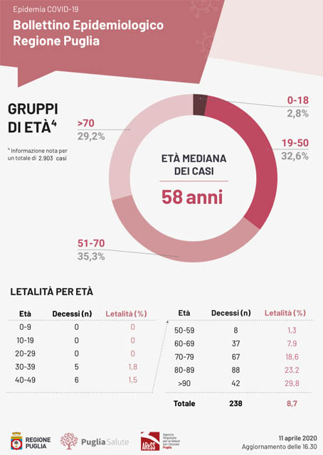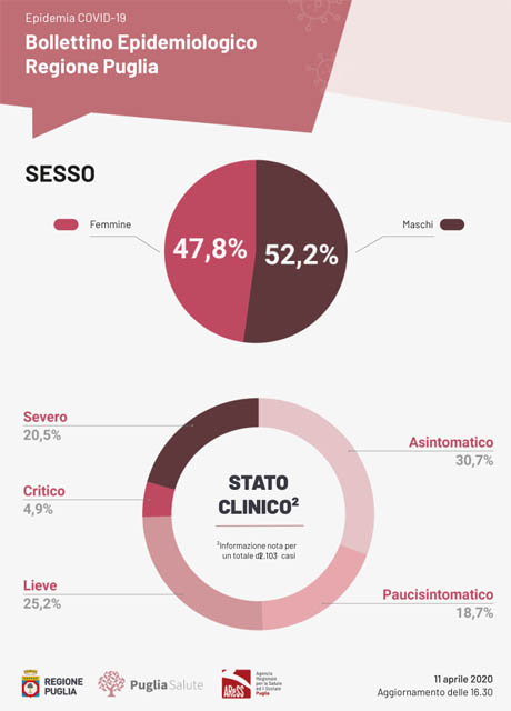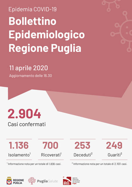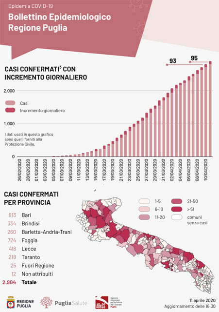 Pubblichiamo il bollettino epidemiologico con riferimento all’11 aprile 2020 su scala Italia e Puglia con il commento tecnico del microbiologo dott. Francesco Antonucci, Dirigente Biologo presso il Policlinico Riuniti di Foggia.