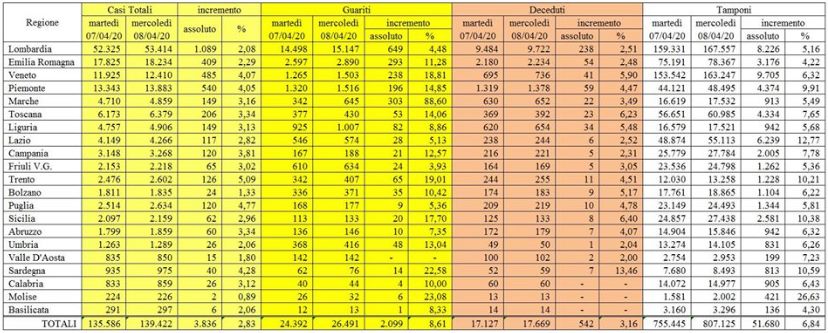 CORONAVIRUS SITUAZIONE ITALIA ALL’8 APRILE 2020 – presso la sede del Dipartimento della Protezione Civile proseguono i lavori del Comitato Operativo al fine di assicurare il coordinamento degli interventi delle componenti e delle strutture operative del Servizio Nazionale della protezione civile. Nell’ambito del monitoraggio sanitario relativo alla diffusione del Coronavirus sul territorio nazionale, al momento 95.262 persone risultano positive al virus. Ad oggi, in Italia sono stati 139.422 i casi totali. Nel dettaglio: i casi attualmente positivi sono 28.545 in Lombardia, 13.110 in Emilia-Romagna, 10.989 in Piemonte, 10.171 in Veneto, 5.557 in Toscana, 3.562 nelle Marche, 3.245 in Liguria, 3.448 nel Lazio, 1.940 nella Provincia autonoma di Trento, 2.859 in Campania, 2.238 in Puglia, 1.415 in Friuli Venezia Giulia, 1.893 in Sicilia, 1.534 in Abruzzo, 1.281 nella Provincia autonoma di Bolzano, 823 in Umbria, 840 in Sardegna, 755 in Calabria, 606 in Valle d’Aosta, 270 in Basilicata e 181 in Molise. Sono 26.491 le persone guarite. I deceduti sono 17.669, ma questo numero potrà essere confermato solo dopo che l’Istituto Superiore di Sanità avrà stabilito la causa effettiva del decesso.