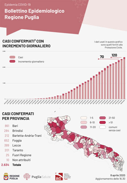 Il totale dei casi positivi Covid in Puglia è di 2.634 così divisi: 861 nella Provincia di Bari; 212 nella Provincia di Bat; 284 nella Provincia di Brindisi; 652 nella Provincia di Foggia; 389 nella Provincia di Lecce; 201 nella Provincia di Taranto; 25 attribuiti a residenti fuori regione; 10 per i quali è in corso l’attribuzione della relativa provincia. I Dipartimenti di prevenzione delle Asl hanno attivato tutte le procedure per l’acquisizione delle notizie anamnestiche ed epidemiologiche, finalizzate a rintracciare i contatti stretti.
