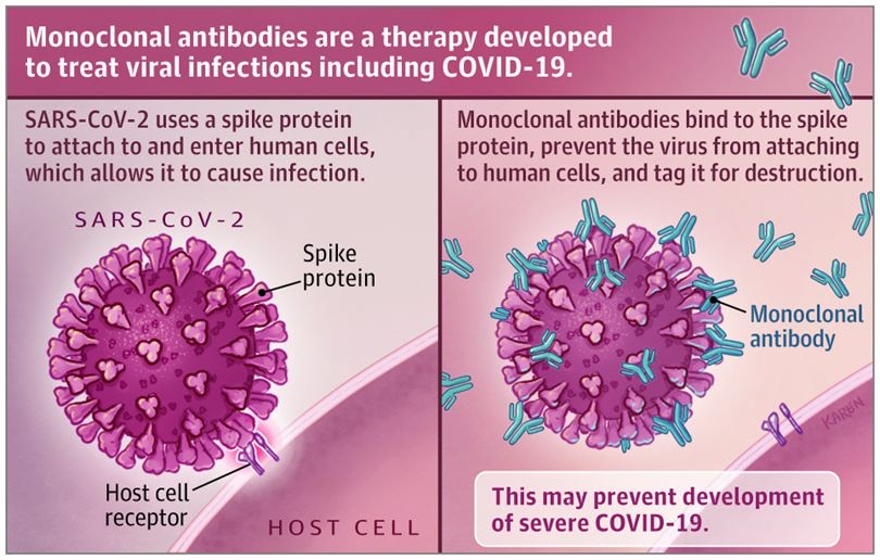 Gli anticorpi monoclonali sono proteine prodotte in laboratorio che presentano le stesse caratteristiche degli anticorpi prodotti dal nostro organismo e che, come gli anticorpi naturali, legandosi al virus SARS-CoV-2, bloccano l’infezione di nuove cellule. In questo modo contribuiscono a ridurre la quantità di virus presente nell’organismo ed aiutano a guarire più velocemente. Si tratta di un’opzione terapeutica nuova rivolta ai soggetti non ospedalizzati che, pur avendo una malattia lieve/moderata, risultano ad alto rischio di sviluppare una forma grave di COVID-19, con conseguente aumento delle probabilità di ospedalizzazione e/o morte. Per questi soggetti a rischio attualmente non è disponibile alcun trattamento standard di provata efficacia.