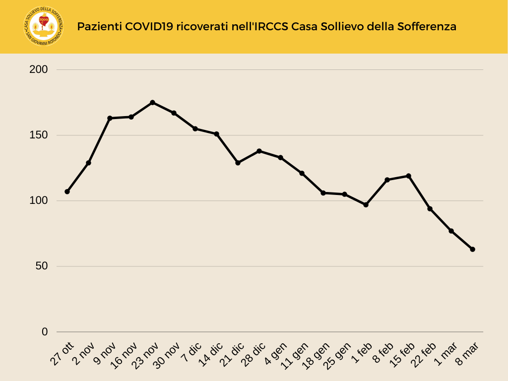 La Direzione Strategica dell’ Ospedale Ecclesiastico Casa Sollievo della Sofferenza di San Giovanni Rotondo (Foggia) informa che il numero dei pazienti Covid-19 ricoverati aggiornato all’ 8 marzo 2021 è il seguente: