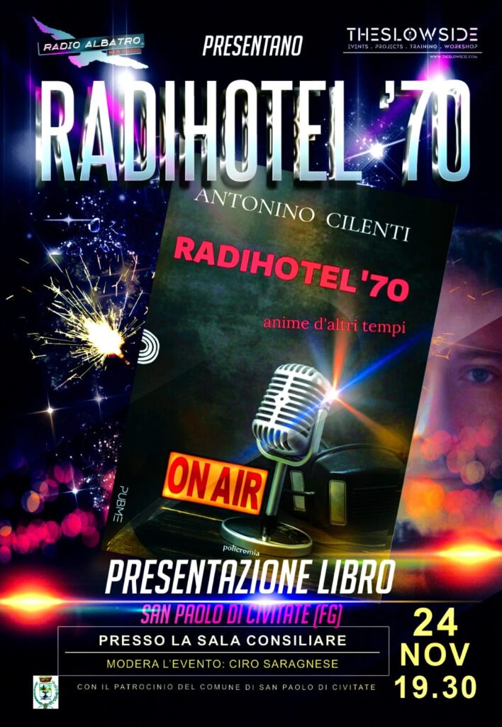 Venerdì 24 Novembre alle 19.30, presso la Sala Consiliare del Comune di San Paolo di Civitate (Fg), Antonino Cilenti presenta il suo libro “Radihotel ’70 – Anime d’altri tempi”. L’evento, organizzato da Radio Albatro in collaborazione con il centro culturale internazionale “The Slow Side”, è Patrocinato dal Comune di San Paolo di Civitate e sarà moderato dal Direttore Artistico di Radio Albatro, Ciro Saragnese.