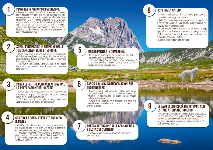 L’obiettivo è, dunque, una campagna all’uso consapevole dell’ambiente montano, con 10 consigli utili a chi sceglie di vivere un’esperienza in alta quota, e  all’importanza di una pianificazione in anticipo dell’escursione, valutando ogni possibile percorso in base alla difficoltà, ai requisiti tecnici e ai rischi, attraverso la scelta dell’itinerario da seguire in funzione delle capacità fisiche e tecniche, l’attenzione e la cura nel preparare lo zaino da portare con sé, il controllo con sufficiente anticipo del meteo e la partenza in compagnia.