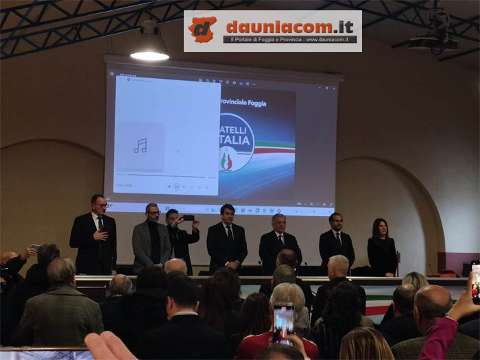(DAUNIACOM) Nella giornata del 27 gennaio 2024 si è svolto nel capoluogo dauno presso l’Auditorium della Formedil CPT il congresso provinciale del partito Fratelli d’Italia. Presente tutto lo stato maggiore provinciale, regionale ed anche l’on. Giandonato La Salandra, la sen. Annamaria Fallucchi ed il Ministro per gli Affari Europei on. Raffaele Fitto. Il Nuovo Presidente Provinciale eletto è il dott. Giannicola De Leonardis che svolge il ruolo di consigliere regionale e di Vice Presidente del Consiglio della Regione Puglia. Oltre quindici comuni della Capitanata al voto a giugno 2024. L’appello all’unità e alla migliore sintesi del nuovo presidente del partito meloniano di Capitanata è stato lanciato alle altre forze politiche della coalizione del centrodestra.