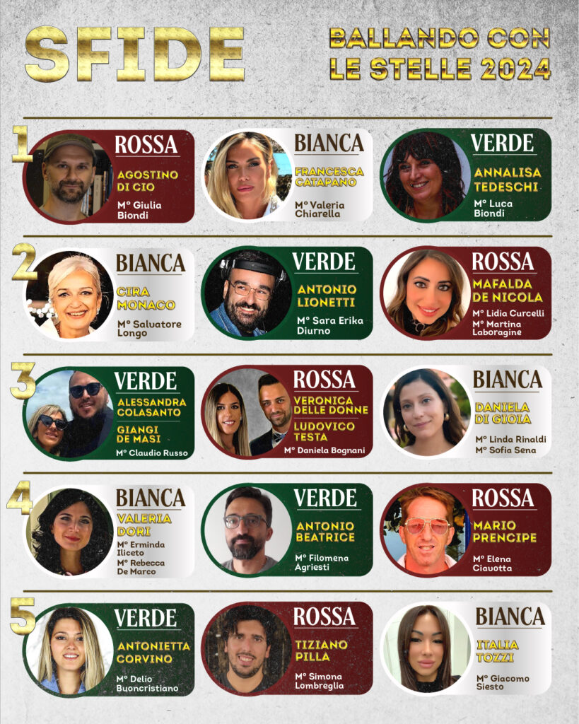 Come sempre, sono tre le squadre che si sfideranno in pista, la Rossa, la Bianca e la Verde, ciascuna composta da cinque coppie di stelle e maestri.