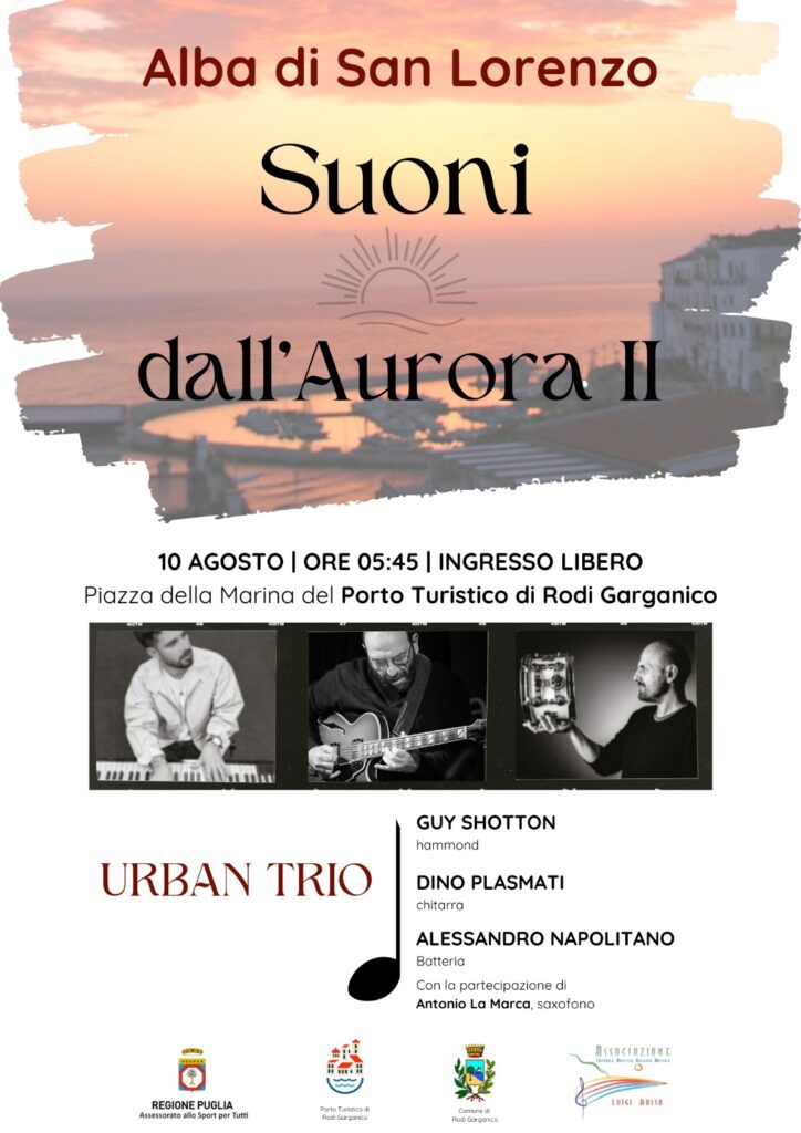 La direzione artistica è di Francesco Mastromatteo, affermato musicista e docente del Conservatorio Giordano di Foggia. A colorare di note l’alba di San Lorenzo sarà l’Urban Trio, formato da noti interpreti internazionali del concertismo jazz: Guy Shotton (hammond), Dino Plasmati (chitarra) e Alessandro Napolitano (batteria), con la partecipazione del talentuoso sassofonista Antonio La Marca. L’Urban Trio è il risultato di un’incredibile sinergia tra tre musicisti straordinari che mescolano la propria esperienza e creatività unica, dando vita a una miscela eclettica di generi musicali che ha come matrice di base il Jazz.