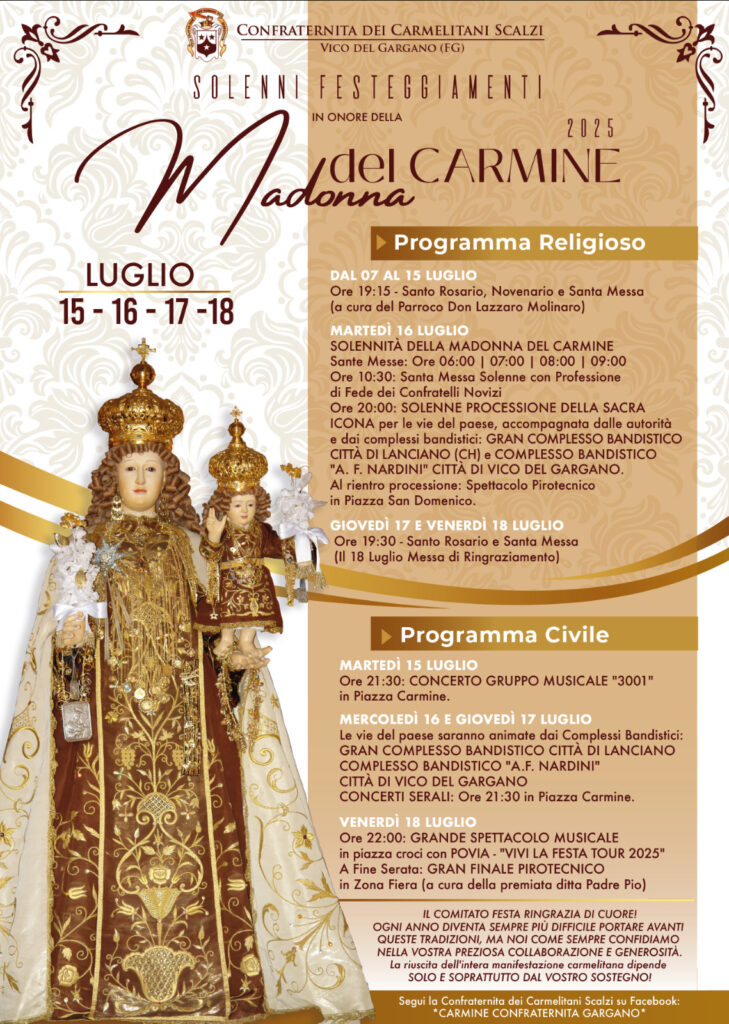 Luglio è sinonimo di festa e devozione a Vico del Gargano, con l’atteso ritorno dei solenni festeggiamenti in onore della **Madonna del Carmine**. Un appuntamento che, come ogni anno, unisce profondamente la comunità e affascina i visitatori, offrendo uno spaccato autentico della ricchezza culturale del Meridione. La giornata **clou sarà il 16 luglio**, quando le vie del borgo saranno animate dalla suggestiva e tradizionale **processione dei Carmelitani Scalzi**. Un evento di rara intensità emotiva, che vedrà la partecipazione non solo dei fedeli e della nostra stimata Confraternita, ma anche delle autorità civili e religiose, in un abbraccio collettivo di fede e appartenenza.