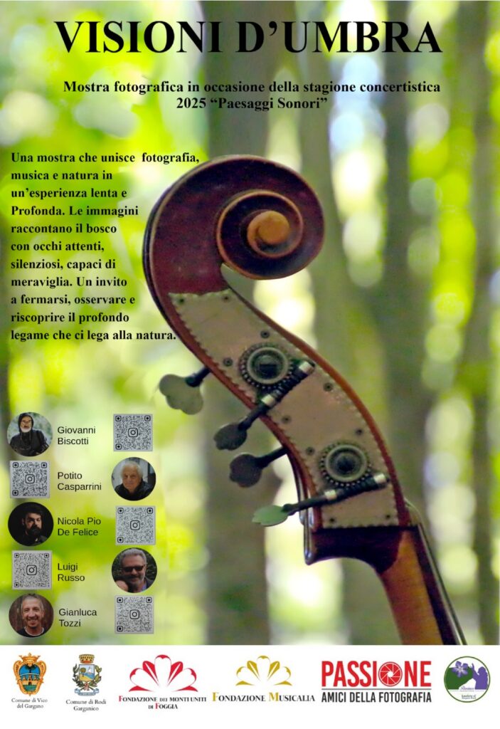 Ad arricchire ulteriormente l’esperienza, sarà possibile ammirare la mostra itinerante “Visioni d’Umbra” degli Amici della Fotografia “Passione”, le cui immagini raccontano il profondo legame tra uomo e natura, offrendo una prospettiva visiva che si sposa perfettamente con l’ascolto della musica e con l’ambiente circostante. Le immagini di Giovanni Biscotti, Potito Casparrini, Nicola Pio De Felice, Luigi Russo e Gianluca Tozzi raccontano il bosco con occhi attenti, silenziosi, capaci di meraviglia.