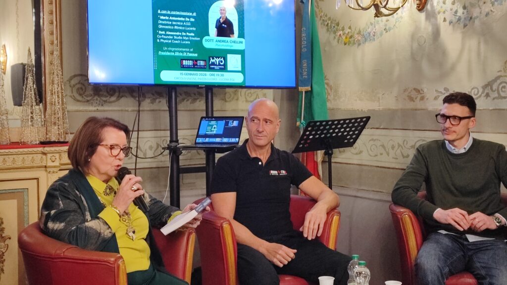 “Migliorare la qualità dell’esercizio attraverso elementi anche psicologici è una cosa che ovviamente ci interessa molto – aggiunge Maria Antonietta de Sio, direttrice tecnica della Ginnastica Luceria – e quindi abbiamo coniugato questa intenzione alla possibilità di avere proprio su Lucera un terminale tecnico e scientifico del network di Chellini, attraverso lo Studio Myo. Naturalmente si tratta di un approccio che le nostre giovani e giovanissime possono considerare anche per la loro vita di tutti i giorni, perché alla fine la felicità va manifestata in tutti gli ambiti, con relativi benefici quotidiani”.