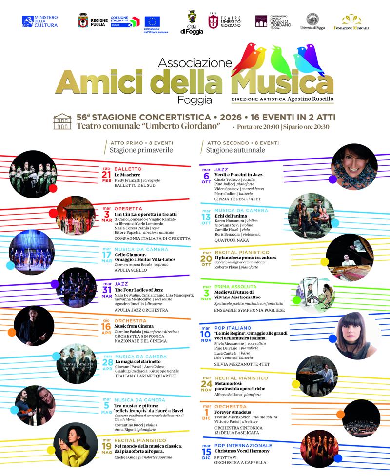 La 56ª Stagione concertistica degli Amici della Musica di Foggia rinnova il suo storico appuntamento con il pubblico del Teatro “Umberto Giordano”, il più antico della Puglia, proponendo un percorso artistico che intreccia tradizione e contemporaneità, grandi repertori e nuove visioni, attraverso sedici eventi, articolati in due atti: primavera e autunno, ancora con la direzione artistica di Agostino Ruscillo.
